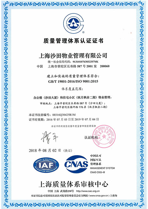 質(zhì)量體系認(rèn)證書2018